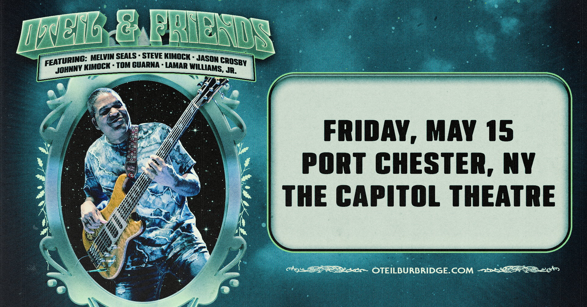 “Oteil & Friends” , which features a rotating cast of all-star musicians (including Melvin Seals, John Kadlecik, T om Guarana, Jeff Chimenti, John Morgan Kimock, Jennifer Hartswick, Jason Crosby, Natalie Cressman, Lamar Williams Jr., and more) began touring in 2017, and continue to play shows and festivals today. In September of 2023, Oteil released Lovely View of Heaven, an emotional tribute to the musical legacy of Jerry Garcia and Robert Hunter while carving a unique path of its own.