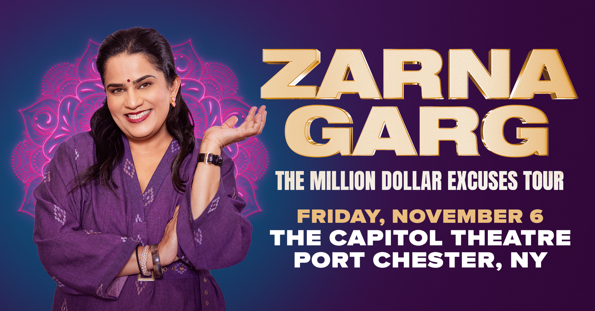 When Zarna's not opening for icons Tina Fey and Amy Poehler on their Restless Leg tour, or building shows with Mindy Kaling and Kevin Hart, she's selling out headlining shows worldwide. Her Practical People Win tour sold out venues across the U.S., Europe, India, Dubai, and Riyadh, and her new global tour, Zarna Garg: Million Dollar Excuses, features an all-new hour of comedy at even bigger venues and theaters.